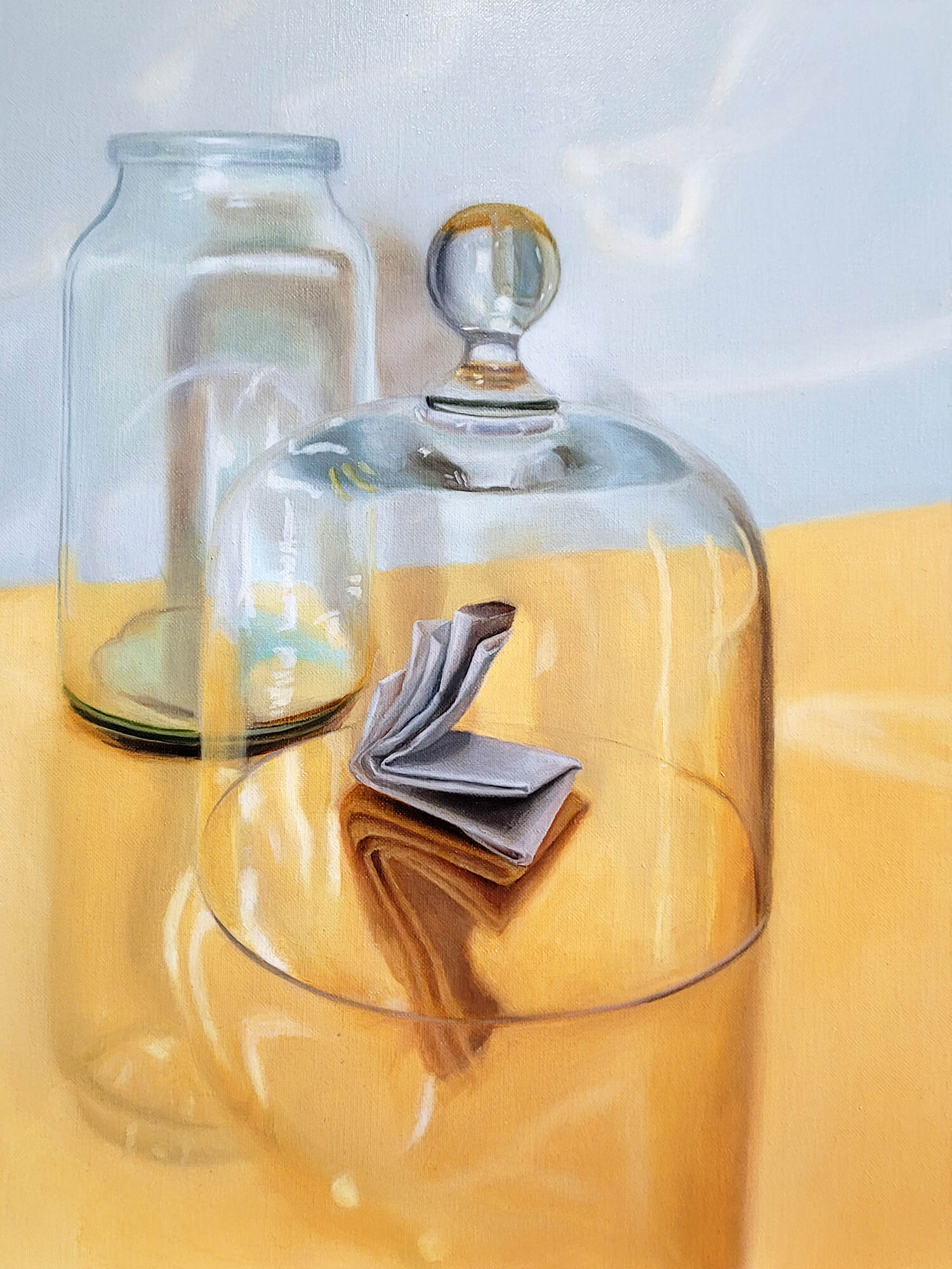 Folded note under a glass cloche, next to an empty jar. Familiar items in unfamiliar conjunctions - puzzling mystery